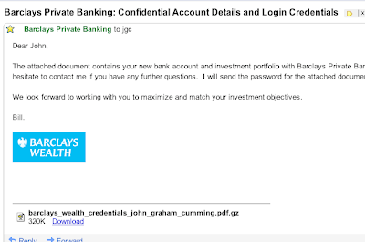 That starred email from "Barclays Private Banking" is entirely fake. If you click it you'll see the following: