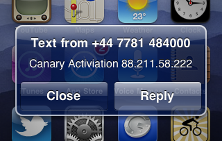 And in clicking on it you've activated the canary. The company logo at the bottom is being loaded externally from a private server that I own. On that server a script logs the complete information about the machine that loaded the picture and sends a text message to my phone: